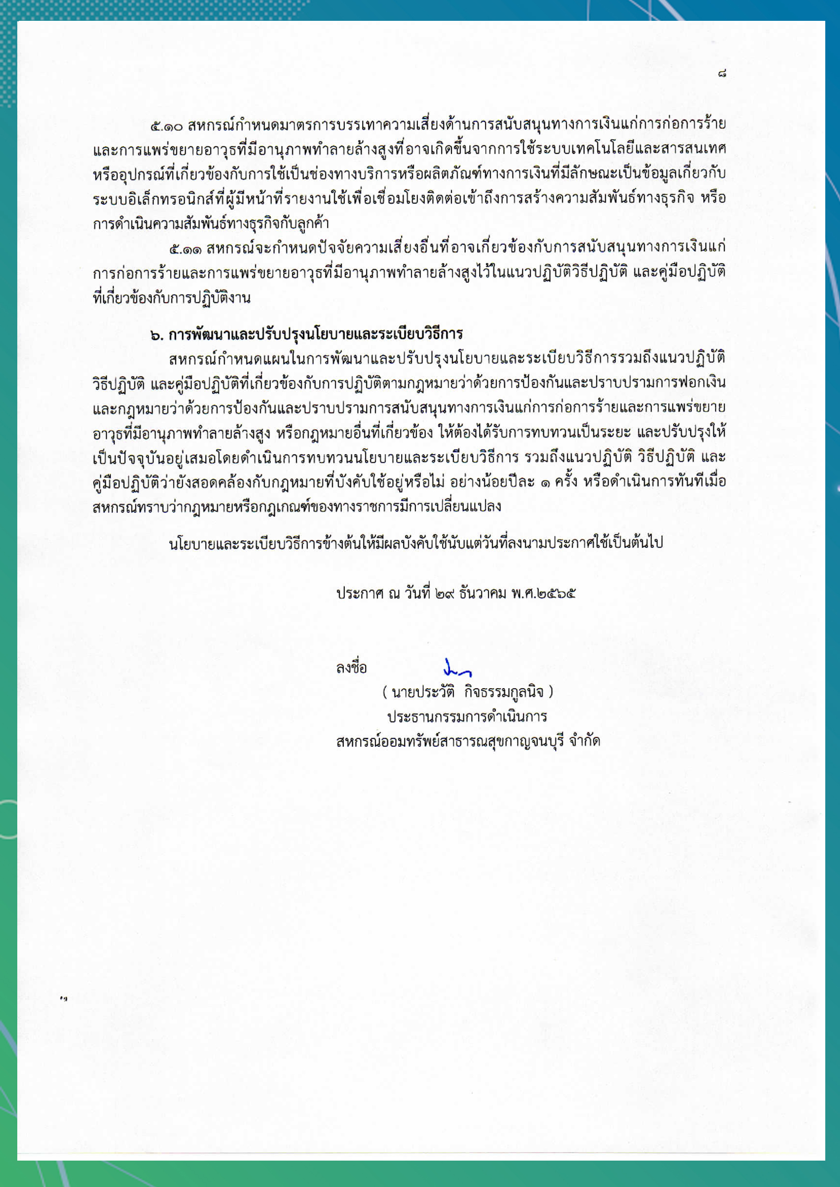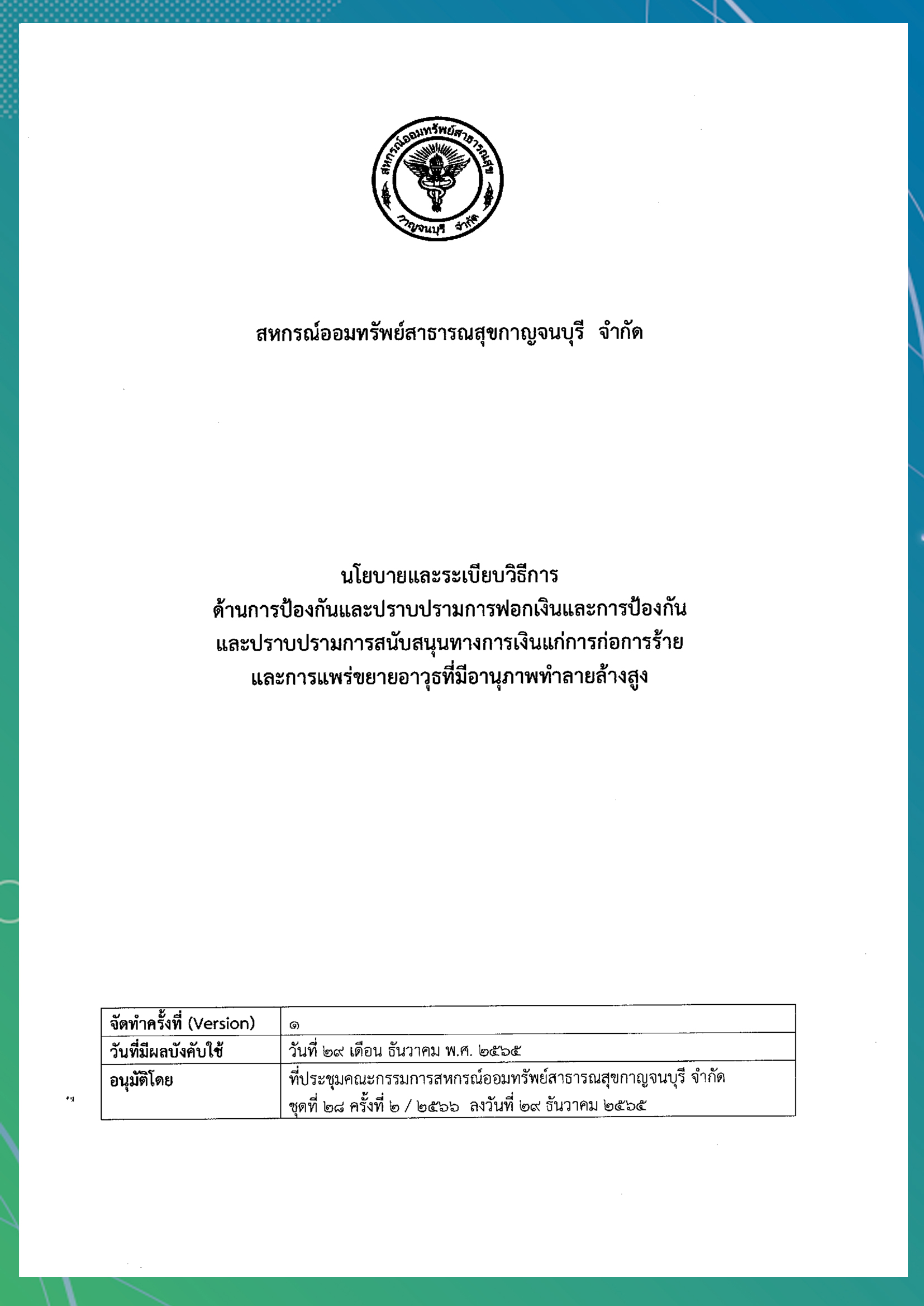 Articles เรื่อง นโยบายด้านการป้องกันและปราบปรามการฟอกเงิน kancoop ประกาศจากสหกรณ์ 17 January 2023 Please Rate Vote 1 Vote 2 Vote 3 Vote 4 Vote 5 Prev Next