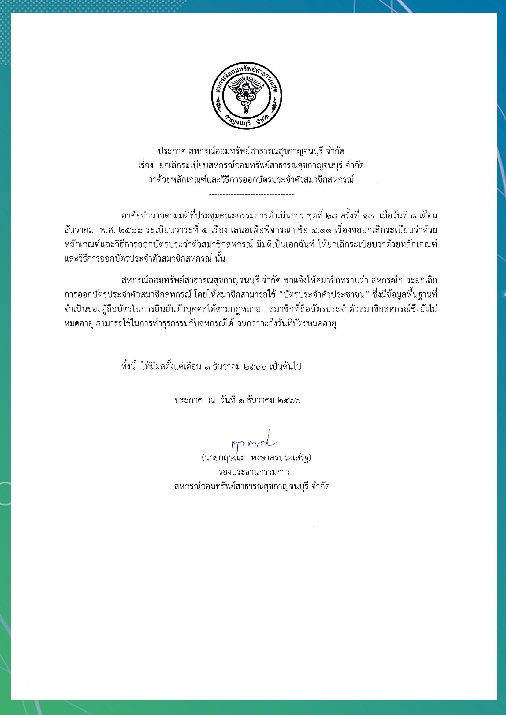 Articles เรื่อง ยกเลิกระเบียบเกี่ยวกับการออกบัตรประจำตัวสมาชิก kancoop ประกาศจากสหกรณ์ 15 December 2023 Please Rate Vote 1 Vote 2 Vote 3 Vote 4 Vote 5 Prev Next