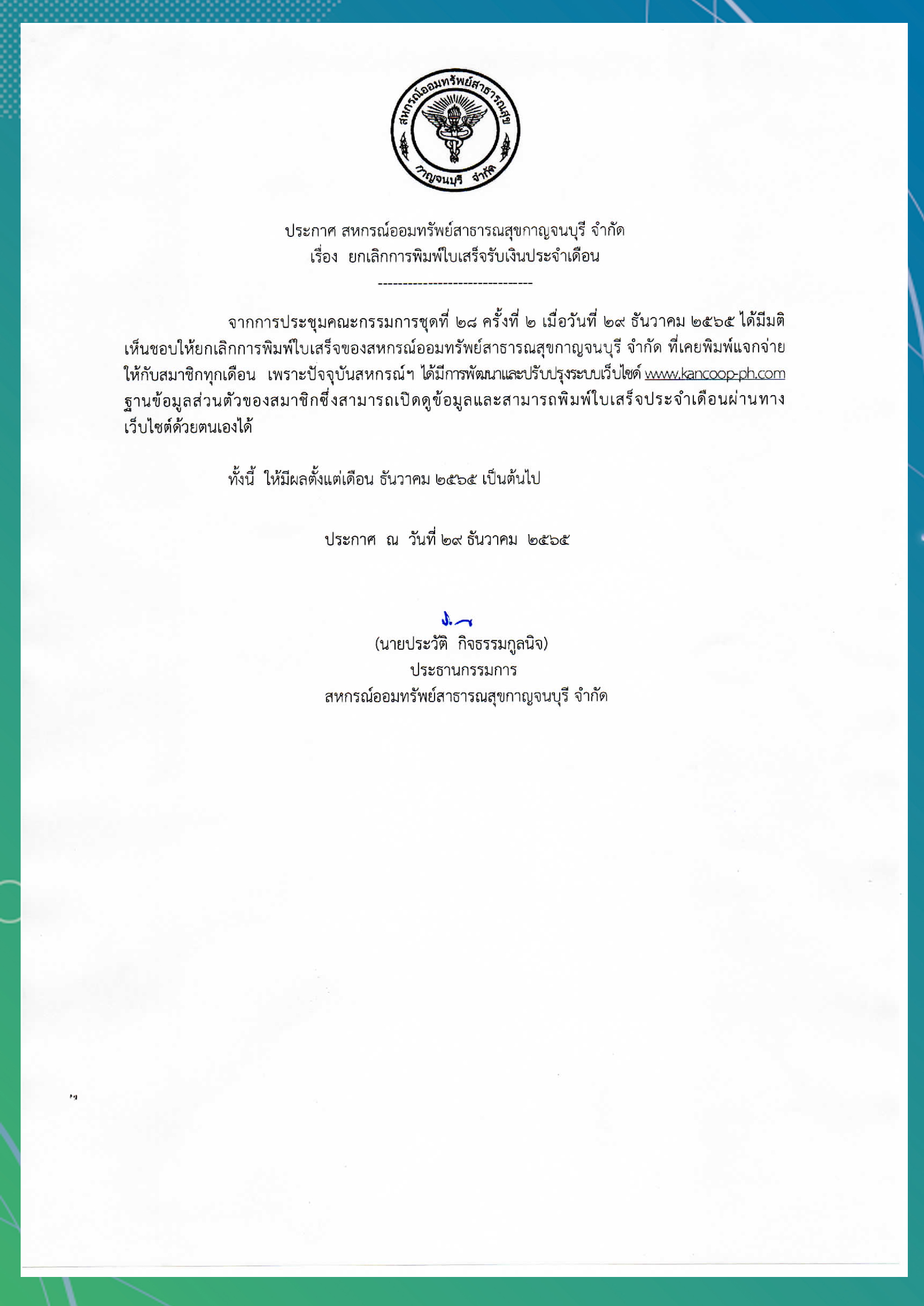 Articles เรื่อง ยกเลิกการพิมพ์ใบเสร็จรับเงินประจำเดือน kancoop ประกาศจากสหกรณ์ 17 January 2023 Please Rate Vote 1 Vote 2 Vote 3 Vote 4 Vote 5 Prev Next