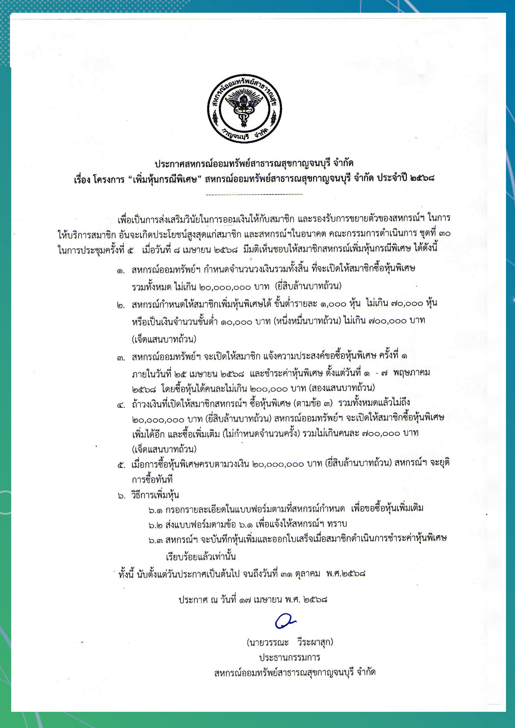 Articles เรื่อง เปิดให้สมาชิกซื้อหุ้นพิเศษ Super User ประกาศจากสหกรณ์ 22 April 2025 Please Rate Vote 1 Vote 2 Vote 3 Vote 4 Vote 5 Prev Next